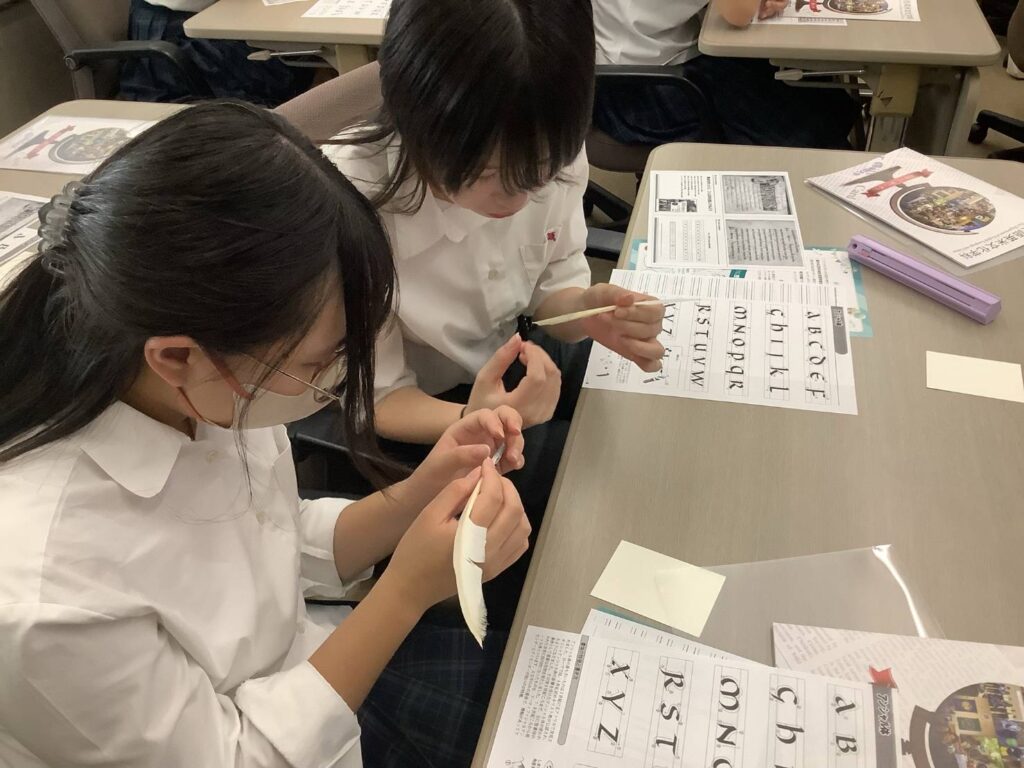 英語英米文化学科ではハリーポッターにも登場する羽根ペンを実際に体験することができました!