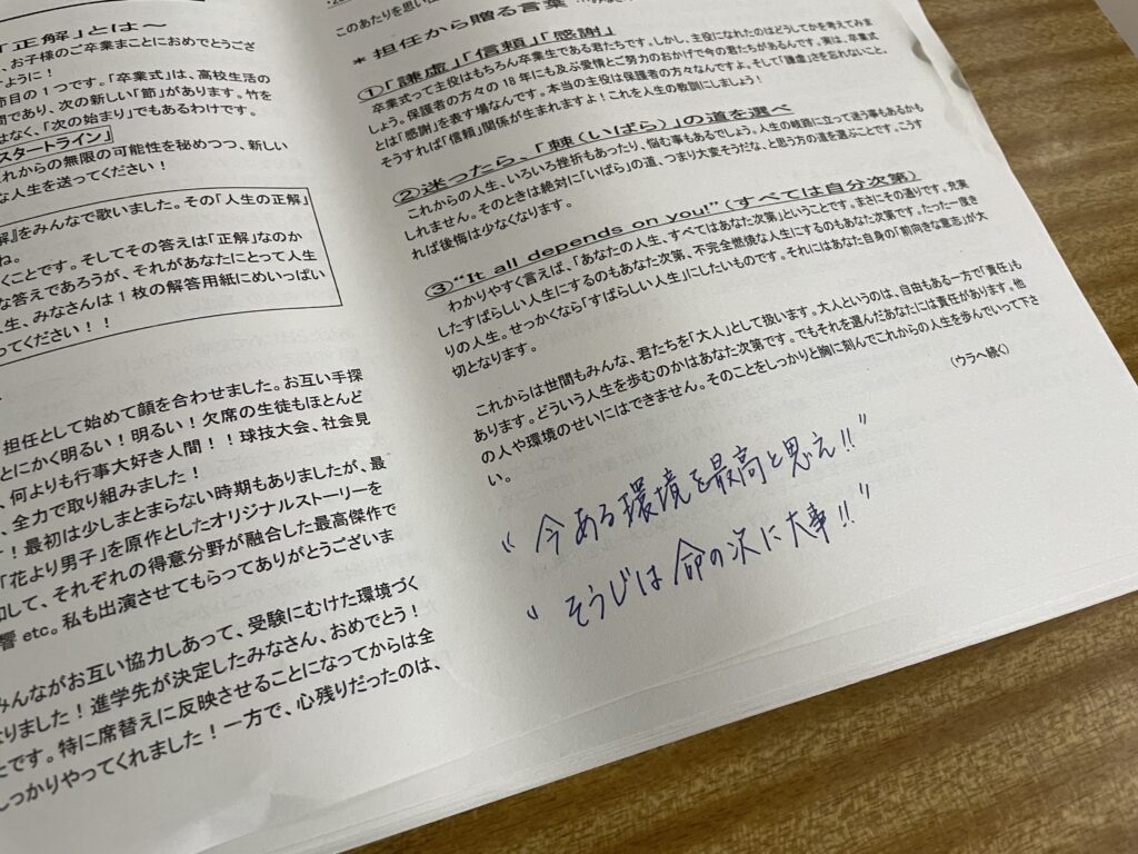 3年間、うれしかったこと、悩んだこと、思いどおりにいかなかったことなど、本当にいろいろあったと思います。その一つひとつの経験が、みなさんを大きく成長させてくれました。