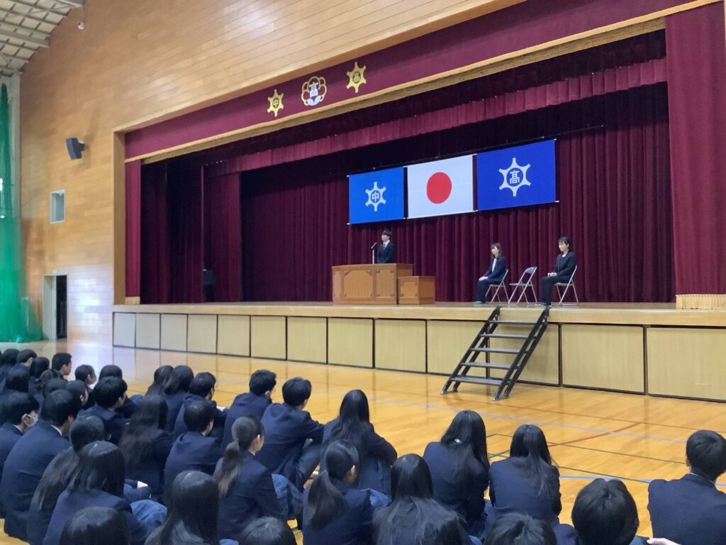 生徒は真剣な表情で話を聞き、それぞれが一年間の自分の成長を振り返っている様子でした。